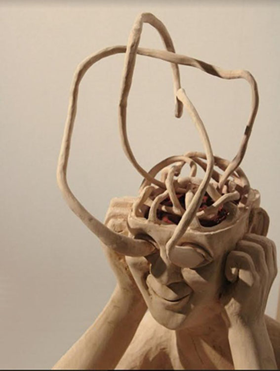 Ainsi entendue, la sculpture est un véritable affolement sur un mode tragi-comique, celui des contes de Shakespeare ou de Lewis Carroll : le cerveau sort de la tête, ses lobes se contorsionnent, les yeux et les oreilles débordent eux aussi, sortent des bords sages où ils sont confinés, coulant l’un sur l’autre et brouillant leurs fonctions respectives. L’œil écoute, l’oreille voit. Les sens se secouent et se prêtent secours pour s’enfoncer dans la secrète élasticité du bois, entendre, palper, toucher d’autres vibrations du monde.