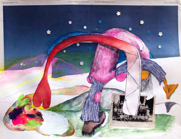 Dans « One two 5 steps loves » un jet de traits au stylo bille suggère un pas imposant, celui de l’ogre qui de son pas de sept lieues enjambe cette belle réserve d’enfants rassemblés pour une photo de classe, une chasse qui se révèle dérisoire, une jambe est lourdement cramponnée au sol, mais l’autre se transforme en pied de canard et l’ogre ne fait que patauger. Tout cela se passe sous un faux ciel émaillé de fleurs factices, mais qui ressuscite dans sa fraîcheur l’antique correspondance entre les fleurs de la prairie et les étoiles dans le ciel. Le mouvement de la main amorce dans le paysage des vallonnements, des cambrures, des chutes de rein. Une autre arche s’ébauche à partir du collage de la photo de classe, vers une autre rive, une palette de couleurs, une mine inépuisable de combinaisons, qui semble bien être la source d’où jaillit le dessin, une approximation exubérante de l’enfance de l’art.