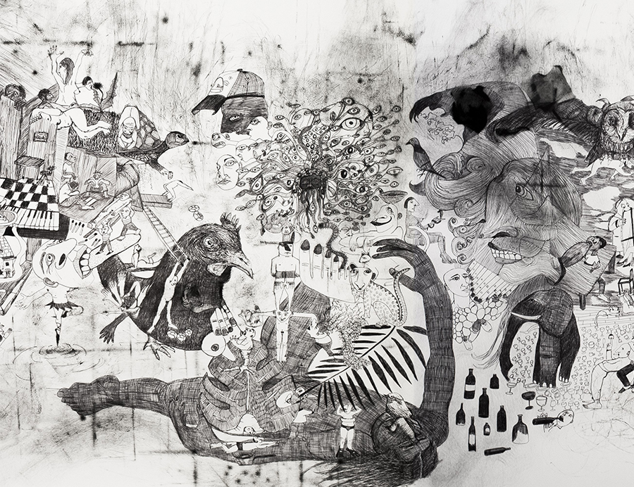 Sa fresque est un dessin, mais dans son esprit c’est comme une gravure ; elle avait sous la main un papier épais sur lequel le stylo ne glisse pas, elle dit s’être reprise à plusieurs fois à inciser son trait dans la matière, avoir même été arrêtée par une tendinite. Elle ne peut parler de son travail sans le dissocier de celui de son père, illustre graveur, fils et petit -fils de graveur, qui réalise des sceaux, des blasons gravés sur chevalières, toute une imagerie associée à l’héraldique pour définir une ligne à transmettre, une histoire, une identité, une empreinte très pure et très vivante, telle la signature d’une personne ou d’une tradition familiale. Dans la même lignée, et parce qu’elle a grandi dans ce champ de forces, Julie se situe dans cette recherche de la « signature des choses », une représentation du monde active jusqu’au seizième siècle, désuète maintenant dans les domaines technique et scientifique, mais toujours fondatrice dans l’esthétique : créer, c’est signifier dans la chose ce qui la relie à toutes les autres choses, la met en résonance avec elles dans un réseau de correspondances, entre ciel et terre. Et donc dans cette fresque les images transitent des constellations du ciel aux choses terrestres qui captent son attention, elles se propagent par contigüité, s’engendrent dans la continuité, se contaminent à mesure que le rouleau se déroule. Elles dessinent des mouvements à suivre, à l’image des caravanes qui traversent la fresque, caravanes de migrants, d’hommes d’affaires, d’oiseaux, des tourbillons et cyclones qui brassent les images, anticipations, signes précurseurs de la voie à suivre pour s’en sortir, de la ligne noire de la création qui s’esquisse depuis les ramures jusqu’aux plumes du corbeau, la ligne de l’outrenoir, la sombre mélodie de la gravure…Une débauche de traits, de hachures, d’estompages pour parvenir à l’horizon entrevu, ébauché, différé et toujours là.