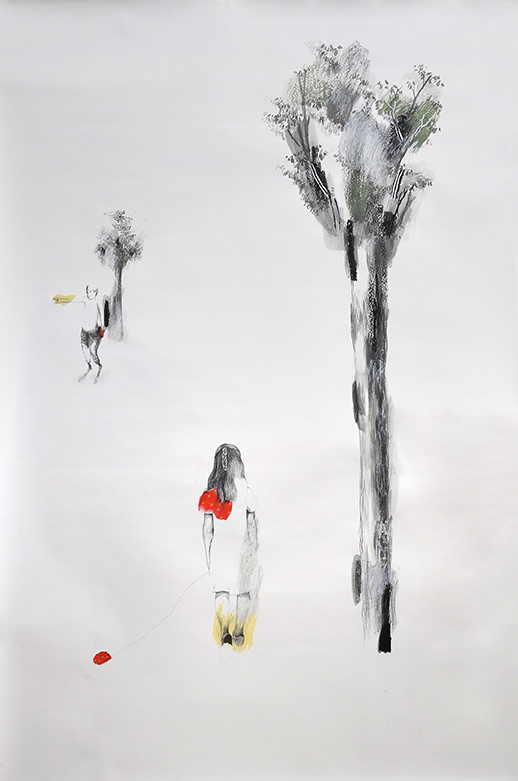 Dans ses grands dessins d’arbres épurés, étirés comme des empreintes de la “nécessité intérieure” Katayoun trace une voie vers le labyrinthe de l’âme, le monde imaginal de la tradition iranienne du XIIème siècle. Les images ne conservent des choses qu’une extériorité minimale, toutes en retentissement, en résonnance, en échos intérieurs de cette rencontre accordée à la nature, au sol et au ciel, au minéral et au végétal. L’arbre se simplifie à l’extrême, se transforme en antenne pour capter cet autre monde. Elle le dessine comme s’il grandissait en elle entre terre et ciel, se courbait et se cambrait en pondérant les masses autour de lui avec une légèreté infinie, se pliait aux injonctions de la petite fille avec sa robe d’enfance de l’art, qui, en retour, a besoin de lui pour s’enfoncer dans son chemin d’ombre et de mystère, traverser les voiles de bleu. Le regard se prend à considérer le dessin comme une cartographie intérieure de l’âme dont on peut lire le cours dans cette ligne axiale autour de laquelle le corps se déplie et s’enveloppe, se ramifie. La ligne de l’âme, la ligne de son horizon.